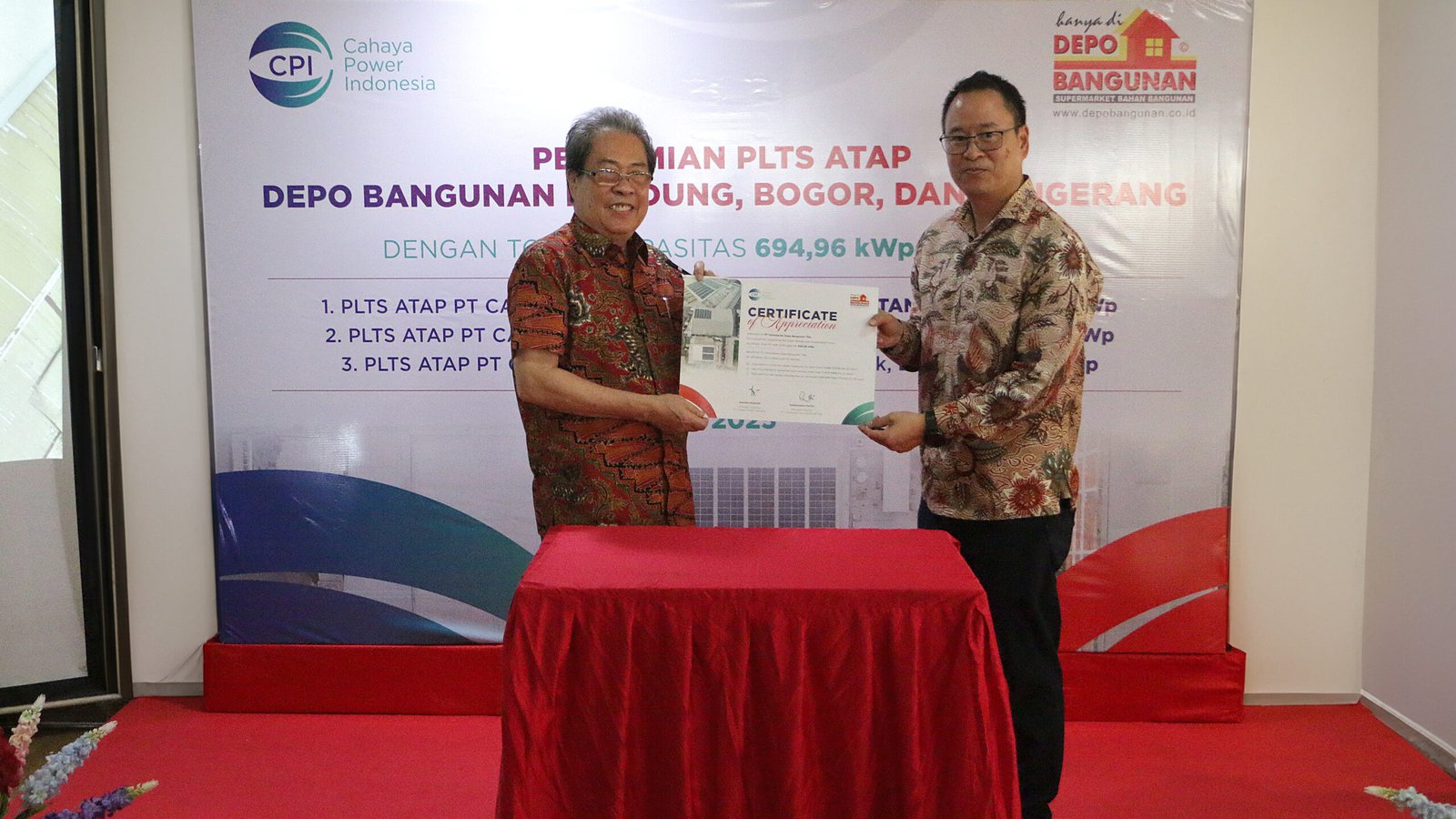 Hadir dalam seremoni peresmian operasional PLTS Atap yang digelar pada Selasa, 20 Mei 2025, Bapak Kambiyanto Kettin, Presiden Direktur PT Caturkarda Depo Bangunan Tbk serta Bapak Kasidis Niamsiri, Presiden Direktur CPI.