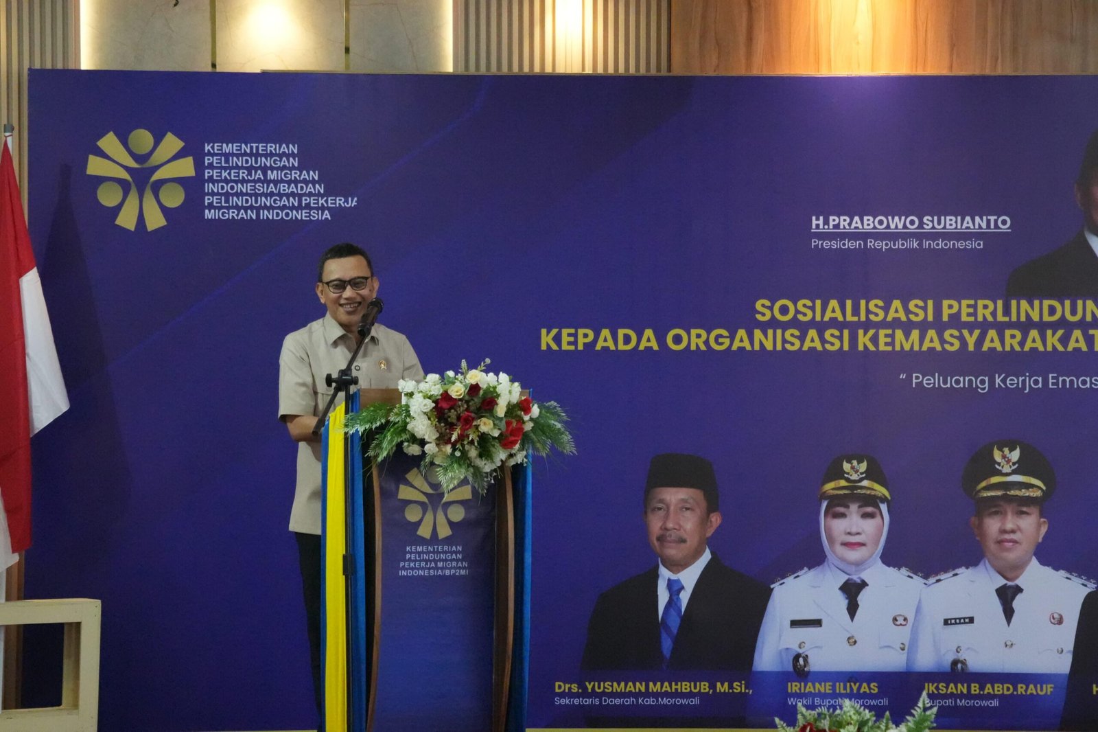 Menteri Karding dalam acara Sosialisasi Pelindungan Pekerja Migran Indonesia bersama organisasi kemasyarakatan dan pemuda di Morowali. (Foto: Kementerian P2MI)