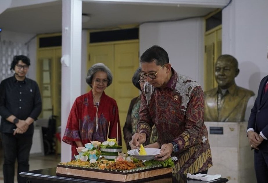 Prosesi keruk tumpeng dilakukan oleh Fadli bersama Wakil Menteri Kebudayaan Giring Ganesha, Dirjen Pelindungan Kebudayaan dan Tradisi Restu Gunawan, serta perwakilan keluarga Bung Hatta, Meutia dan Gemala Hatta.