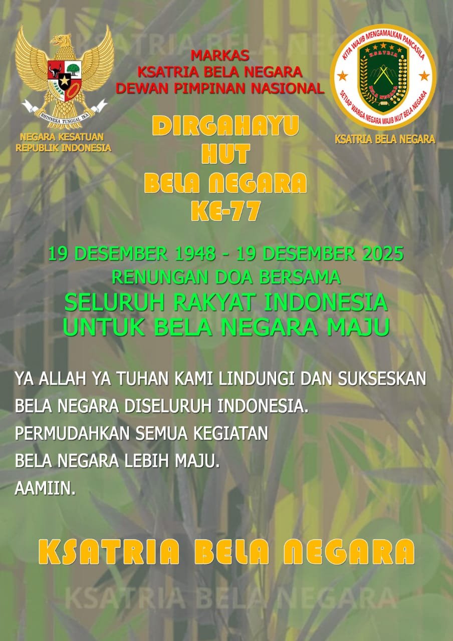 Ketua Nasional Ksatria Bela Negara ( A. Harahap ) dan Jajarannya, Mengucapkan Dirgahayu BELA NEGARA dikasih oleh tuhan yang maha kuasa Allah SWT semakin maju dan sejahtera Bela Negara di seluruh Indonesia.
