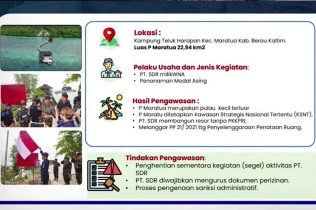 Melalui siaran press conferenmce, Dirjen Pengawasan Sumber Daya Kelautan dan Perikanan (PSDKP) Kementerian Kelautan dan Perikanan (KKP), Pung Nugroho Saksono Pulau di Maratua, Kalimantan Timur, fakta di lapangan menunjukkan aktivitas wisata dikelola pihak asing tanpa izin resmi. Pengelola bahkan tidak berada di Indonesia, namun tetap mengendalikan pembangunan vila melalui aliran dana dari luar negeri.