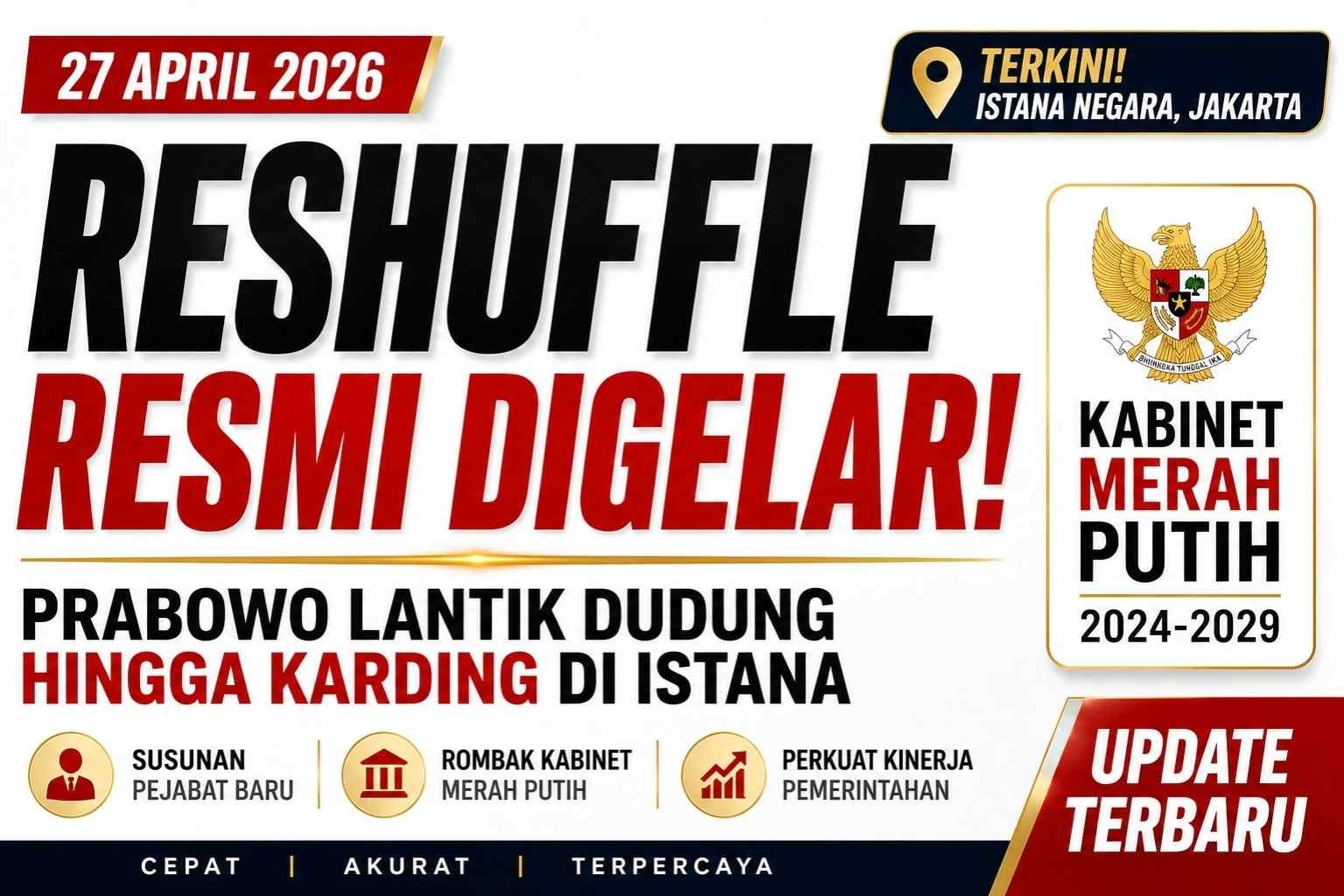 PROTIMES.CO – Presiden Prabowo Subianto resmi melakukan reshuffle kabinet dengan melantik sejumlah menteri, wakil menteri, dan kepala badan negara dalam prosesi kenegaraan di Istana Negara, Jakarta, Senin, 27 April 2026, sebagai bagian dari penataan ulang struktur pemerintahan periode 2024–2029.