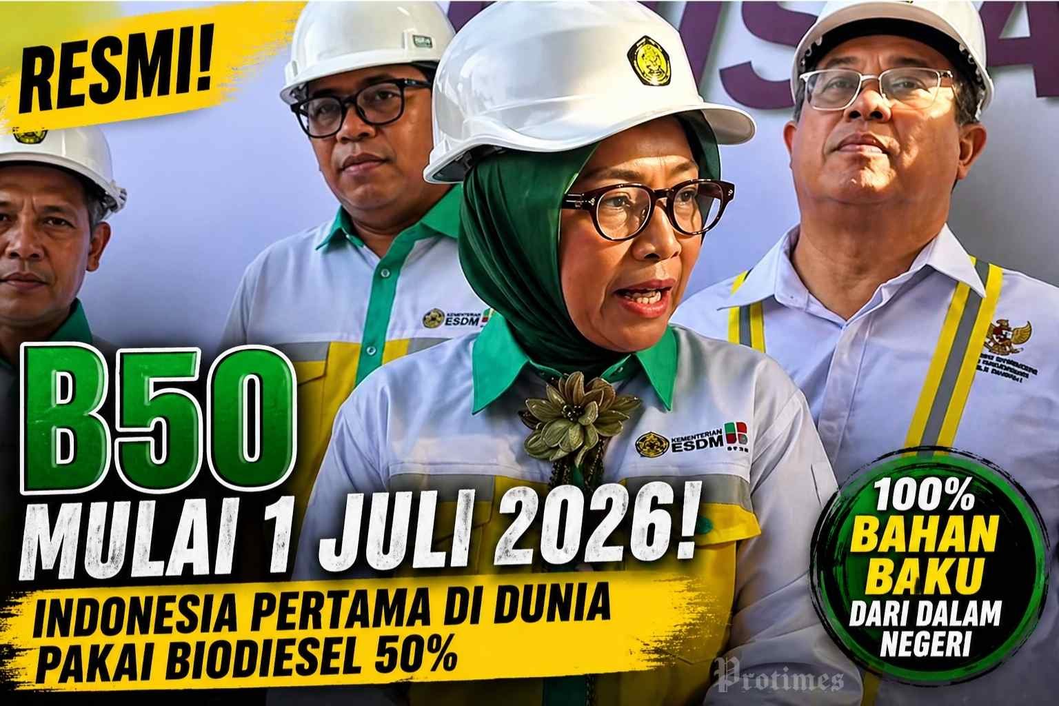 PROTIMES.CO – Pemerintah Indonesia resmi menetapkan penerapan bahan bakar B50 secara nasional mulai 1 Juli 2026, sebuah langkah yang langsung menempatkan Indonesia sebagai negara pertama di dunia yang menggunakan campuran 50 persen biodiesel berbasis sawit dalam bahan bakar solar. Kebijakan ini digerakkan oleh Kementerian Energi dan Sumber Daya Mineral dengan dukungan lintas sektor, termasuk Pertamina Patra Niaga dan PT Kereta Api Indonesia.